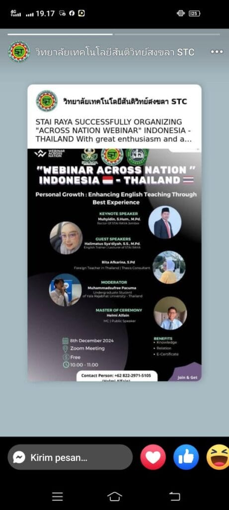 Webinar Across Nation Indonesia – Thailand: Santiwit Songkhla Technological College Sambut Antusias Kerja Sama dengan STAI RAYA Mlokorejo Jember