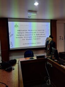 Dalam forum tersebut, Achmad Mahrus Helmi, yang juga tercatat sebagai mahasiswa Program Doktor UIN KHAS Jember, mempresentasikan hasil penelitiannya yang berjudul “Habituation Moderation Learning Religion (Wasathiyyah) In Islamic Religious Education In Multicultural Schools: Strategies And Implications For Student Tolerance.” Topik ini menyoroti pentingnya pembelajaran agama Islam yang moderat dalam lingkungan sekolah multikultural serta dampaknya terhadap peningkatan toleransi siswa.